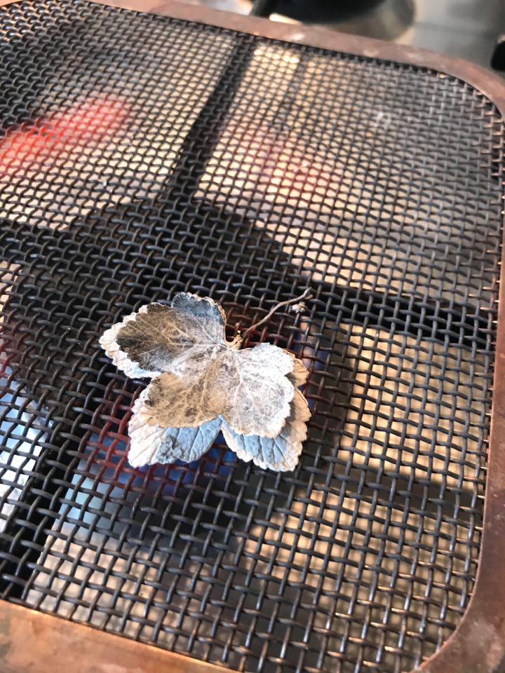 The leaf burns away to reveal a real leaf cast in solid silver.