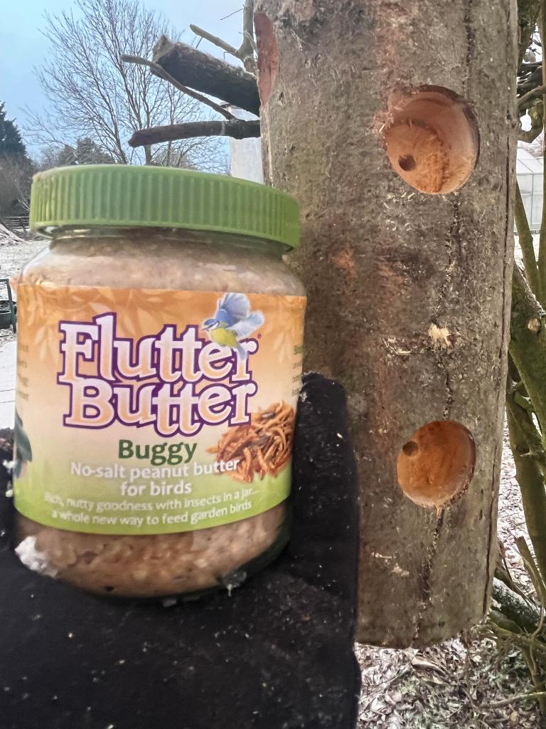 Fill the log with bird food. I love Flutter Butter. It is easy to add to the holes. The buggy one with insects in is great for insect feeding birds like Woodpeckers. Never use peanut butter for humans – it’s too full of salt. You could also fill it with my homemade fat ball recipe – just wait for it to solidify a bit before you add it to the feeder or it will pour out. I have a vegetarian version of the recipe too.