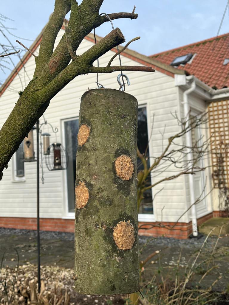 Like any wildlife feeding station, you need to keep it clean to prevent disease spreading. There are so many birds here that they literally clean out every scrap here within 24 hours or so. But, if yours is left then you will need to clean it out to stop it going mouldy. Use boiling water to clean the holes in the log and the areas around – in case they have been pooped on.